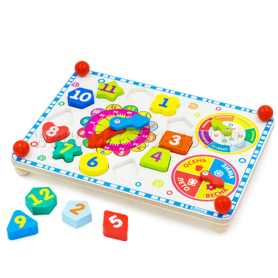 Фигуры расположены вокруг циферблата. С обозначением цифр от 1 до 12, разной формы и разных цветов. Поможет малышу познакомиться с геометрическими фигурами, развить логику, мелкую моторику. - Держатели-шарики по углам 4 шт.