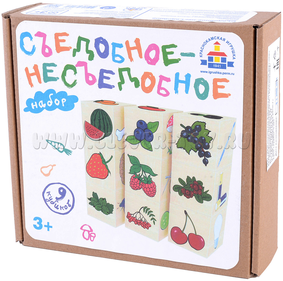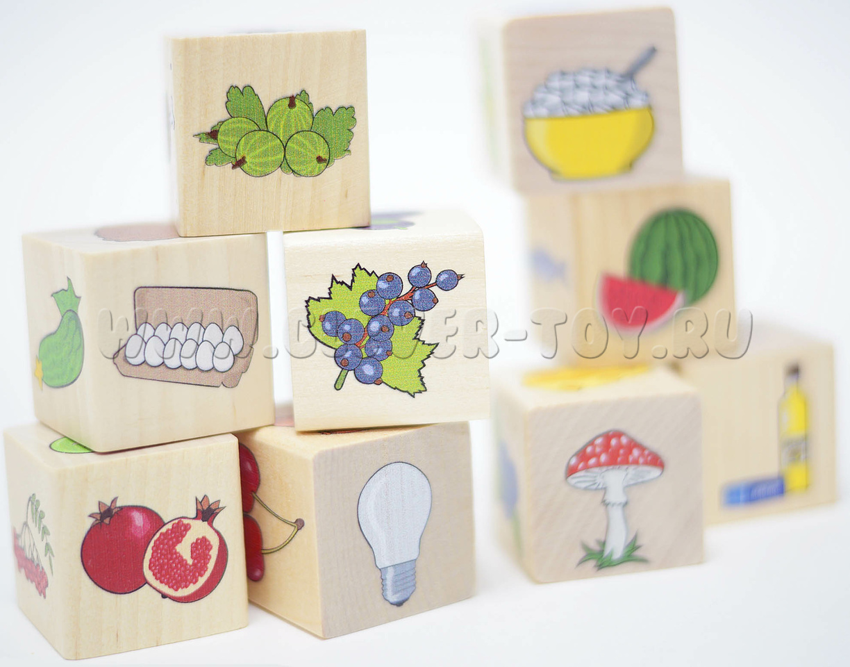 • 9 кубиков с изображениями продуктов питания и несъедобными предметами.