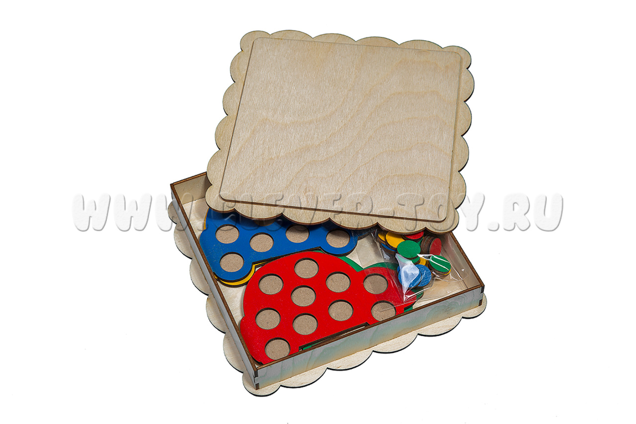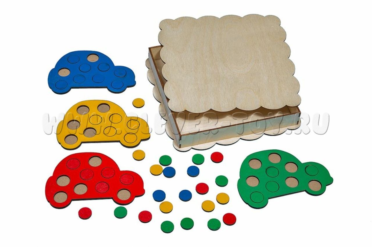 4 машинки разных цветов (15*16см) и 40 кружков (4 цвета по 10шт, диаметр 2см) упакованы в деревянную коробку (21*21см).