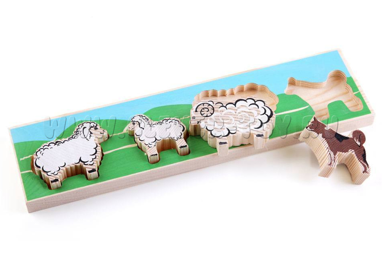 Планшет состоит из 4 вкладышей с изображениями 3 овечек разного размера и четвероногого сторожа.