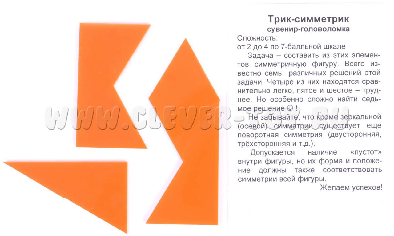 Головоломка "Трик-симметрик" - это современная и увлекательная игра, которая развивает логическое мышление и способствует развитию полезных навыков, как у детей, так и у взрослых. Главная задача этой головоломки состоит в том, чтобы составить симметричную фигуру из трех элементов. Известно, что существует всего 7 решений, причем нахождение шестого и седьмого решения является наиболее сложной частью игры.