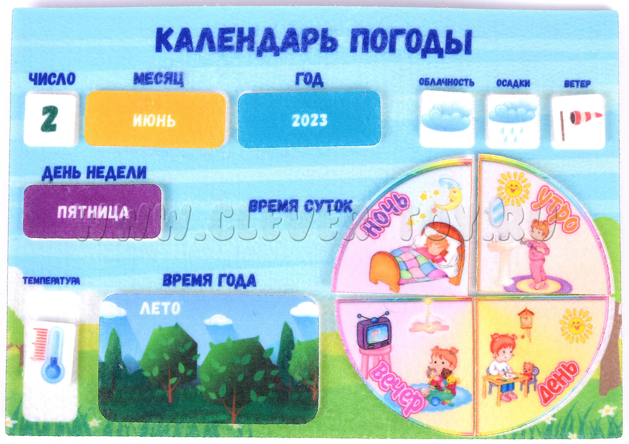 Научить ребенка пользоваться календарем – задача непростая, но важная. В этом родителям поможет мягкий конструктор «Календарь погоды» – яркое и наглядное учебное пособие, с которым изучать времена года станет проще и интереснее. Регулярные занятия с аппликацией помогут малышу освоить календарь, сформировать привычку жить по режиму и планировать свое время.