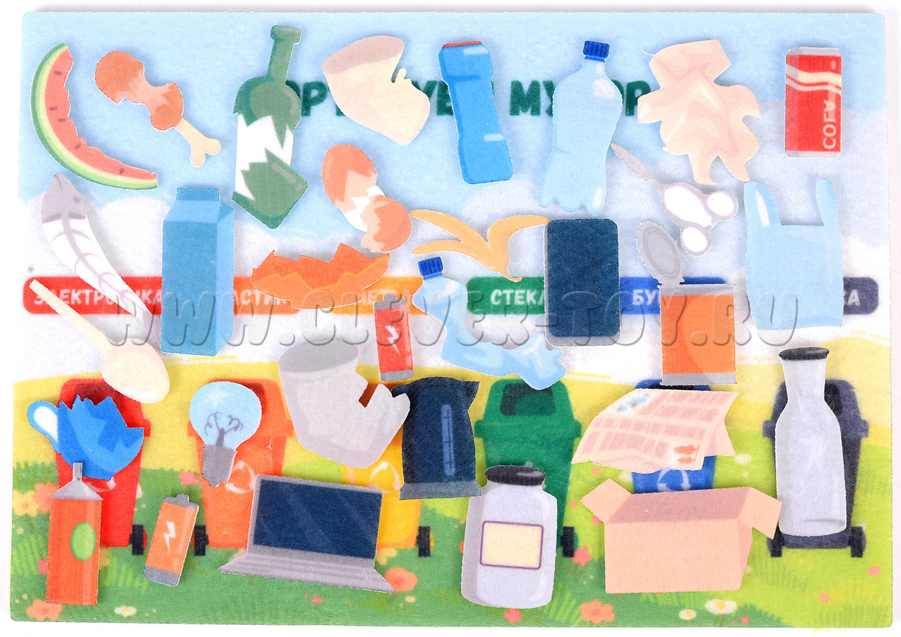 В наборе вы найдёте 31 фигурку, выполненную из мягкого и приятного на ощупь материала — фетра. Каждая фигурка представляет собой определённый вид мусора: бумага, пластик, стекло, органические отходы и т. д. Фигурки крепятся к игровому полю с помощью липучек, что позволяет детям легко и безопасно сортировать их.