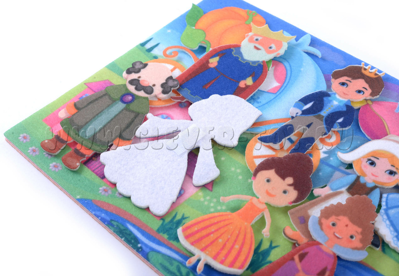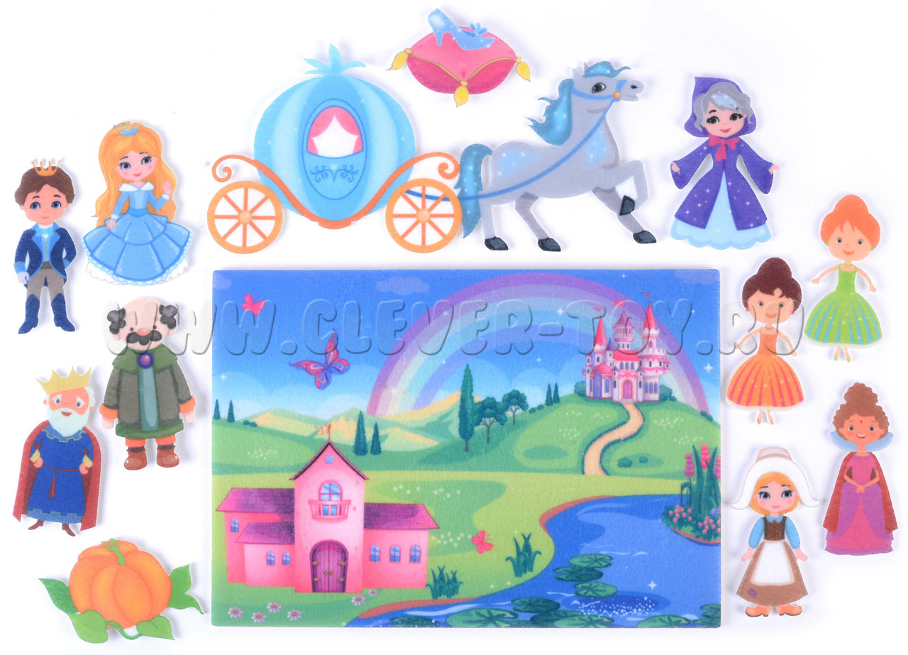 Передвигая по мягкой основе фигурки персонажей Шарля Перро, родители и дети могут разыгрывать известный сюжет по ролям, или же придумать абсолютно новую историю. В процессе игры можно обсудить с малышом сказку и ее героев: «Чего еще могла пожелать Золушка?», «Какие приключения ждут ее и принца?» и др.
