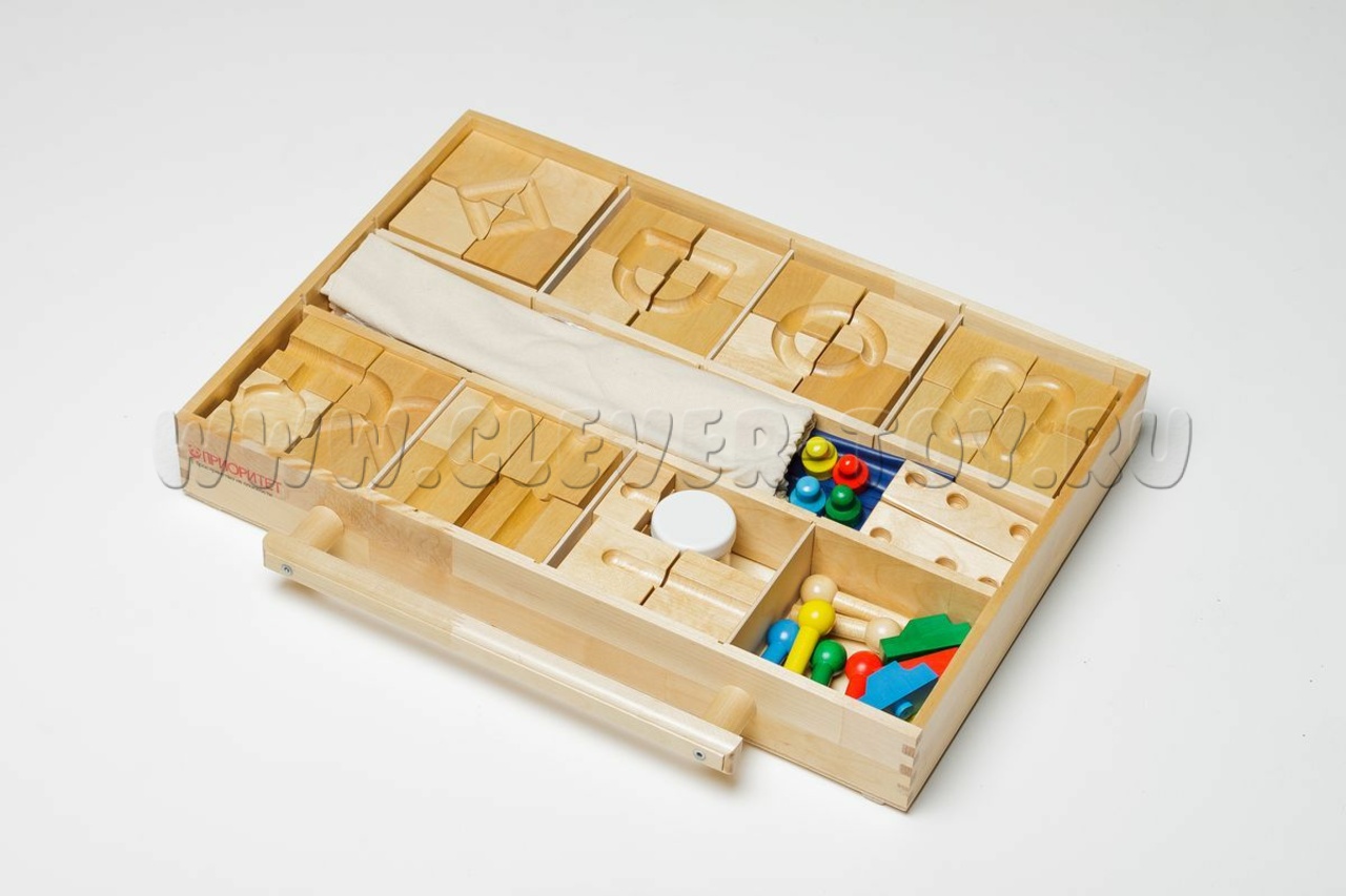 Более 1000 мелких деталей: резиночки, бусины, шнурочки, цилиндрики, набор для завинчивания, игральные кости. На доске с отверстиями ребёнок выкладывает узоры, соединяет элементы, повторяет заданный рисунок. Развивает мелкую моторику и хватательные движения.