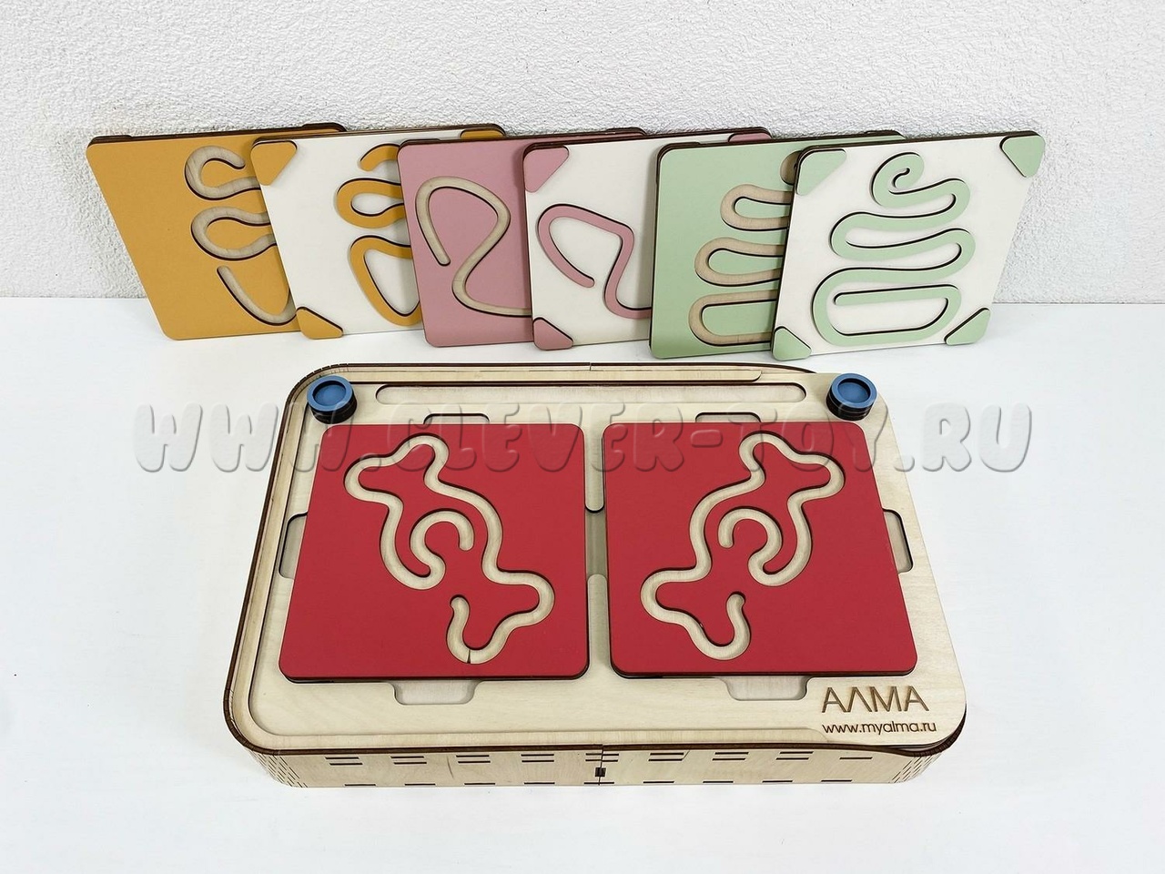 Два лабиринта с изображениями, расположенными симметрично, вставляются в пазы, и ребёнок проходит их с помощью специальных пальчиковых фишек.