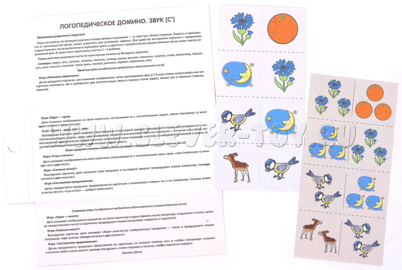 Учебно-игровой комплект "Логопедическое домино" - это набор из 12 обучающих карточек с 48 парными цветными картинками. В процессе игры ребёнок научится правильно произносить свистящий звук [с'], образовывать множественное число существительных и согласовывать их с числительными и прилагательными.