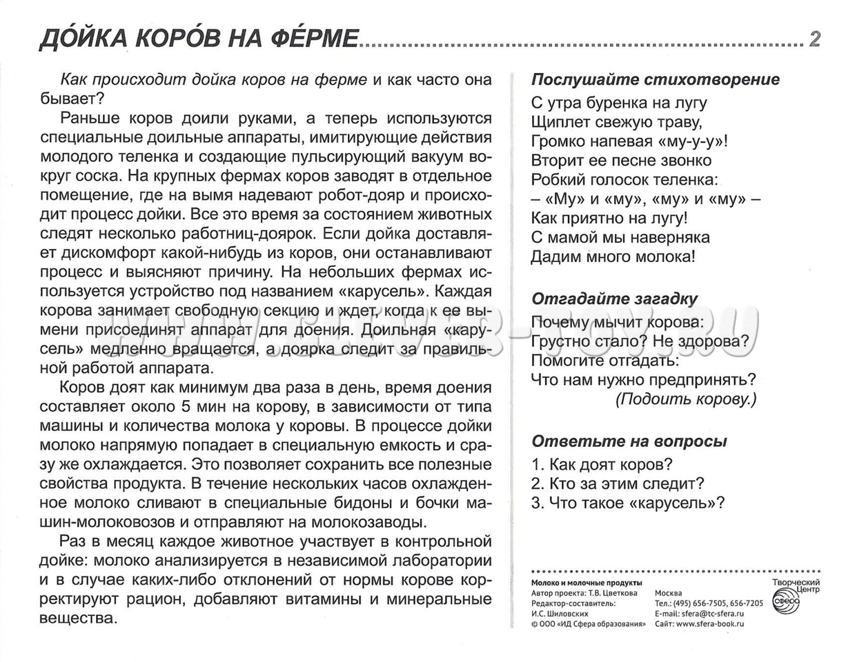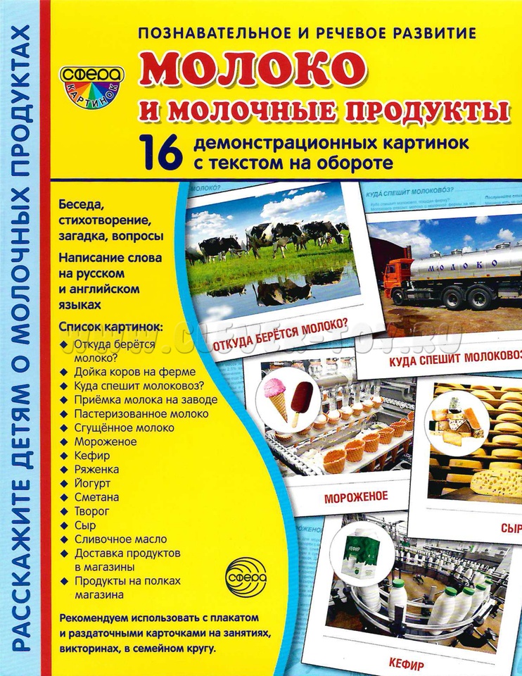 Комплект состоит из 16 цветных демонстрационных картинок, адресован детям и их родителям, желающим познакомиться с современными технологиями изготовления молочной продукции, ее многообразием и значением для жизнедеятельности человека.
