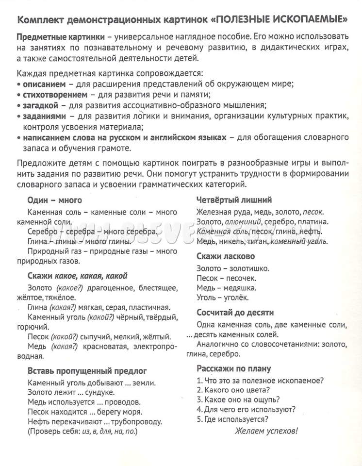 Комплект "Полезные ископаемые" состоит из 16 цветных демонстрационных карточек (картинок) и адресован детям и их родителям, желающим познакомиться с полезными ископаемыми, добываемыми на территории нашей страны.
