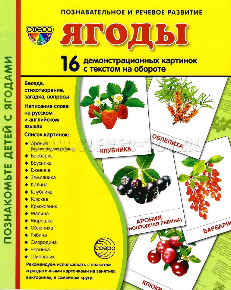 Комплект "Ягоды" состоит из 16 цветных демонстрационных карточек (картинок) и адресован детям и их родителям, желающим познакомиться с полезными ягодами, растущими на территории нашей страны.