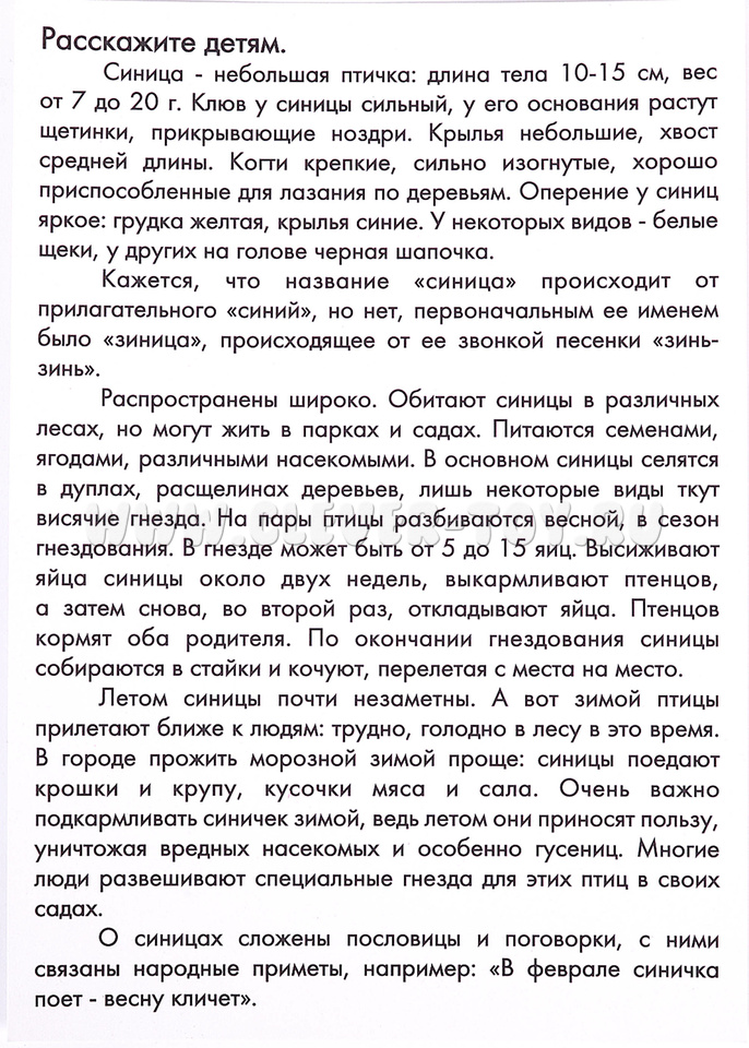 На одной стороне карточки расположена яркая картинка с изображением и названием птицы (изображение детальное и реалистичное), на обратной стороне – доступная для ребёнка информация о городских птицах (описывает внешний вид птицы, ареал обитания, особенности питания и строения, интересные факты о жизни птиц).