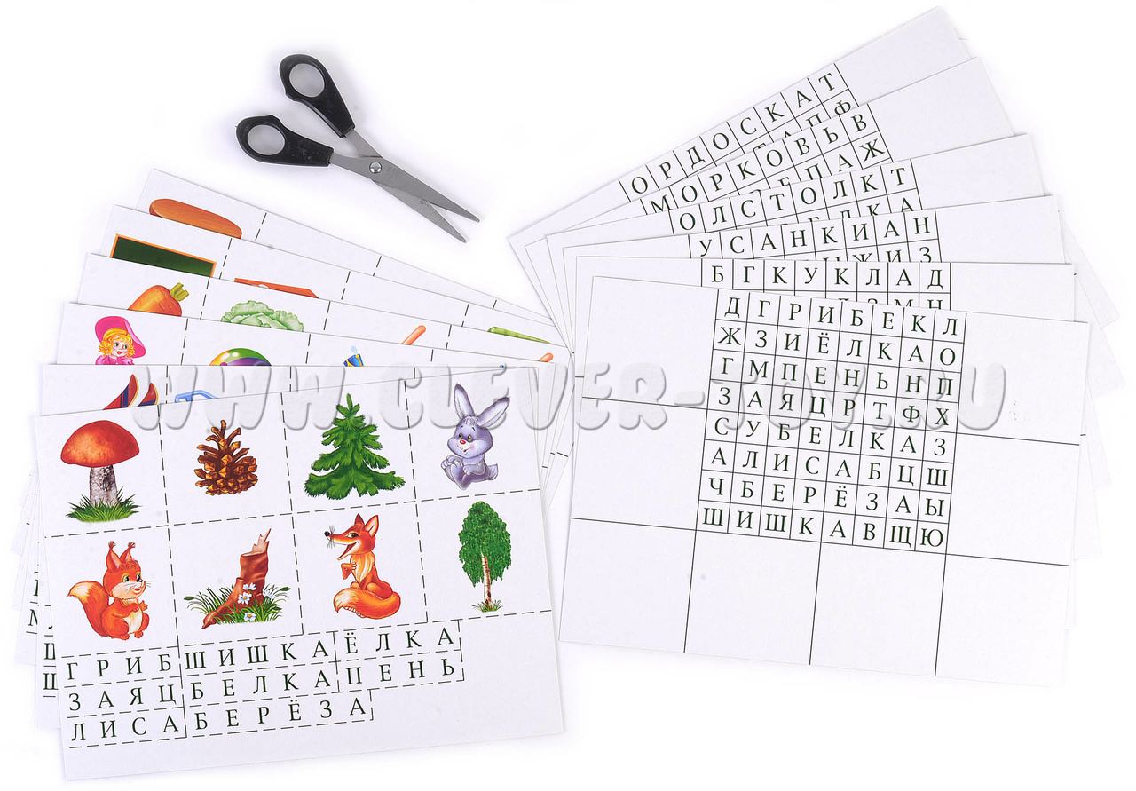 Раздайте детям карточки с таблицами и предложите найти в таблице слова и прочитать их. Затем покажите карточки с предметами. Пусть дети выберут картинки, на которых есть названия предметов из таблицы. После этого нужно закрыть слова в таблице карточками со словами.Попросите детей назвать темы, на которые они собрали картинки («Зима», «Огород» и так далее).