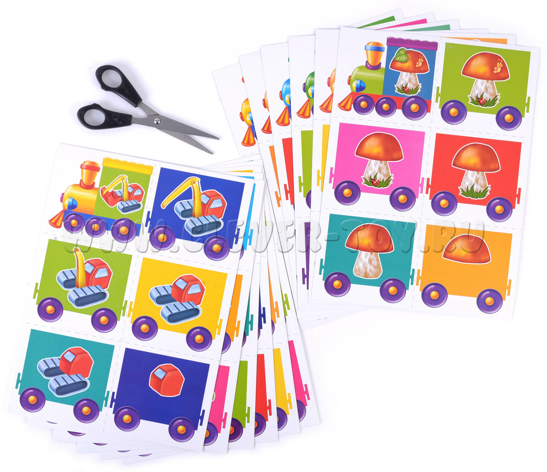 1. Раздайте карточки с паровозиками детям поровну. Затем ведущий показывает поочерёдно остальные карточки, а дети смотрят, кому они подходят. Когда все шесть картинок будут собраны, нужно разложить их поровну в соответствии с последовательностью рисования картинки.