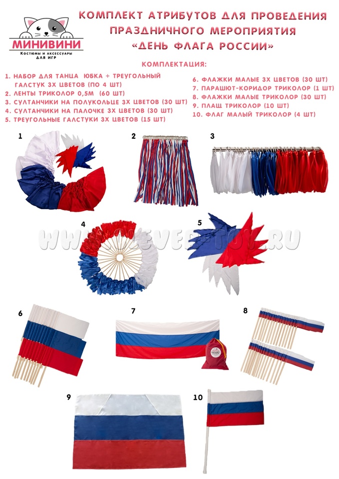 Вам больше не нужно отдельно искать флажки, ленты и плащи у разных поставщиков и переживать, хватит ли реквизита на всех детей. В этом наборе собрано всё необходимое для одновременного участия большой группы, оформленной в цветах российского триколора.