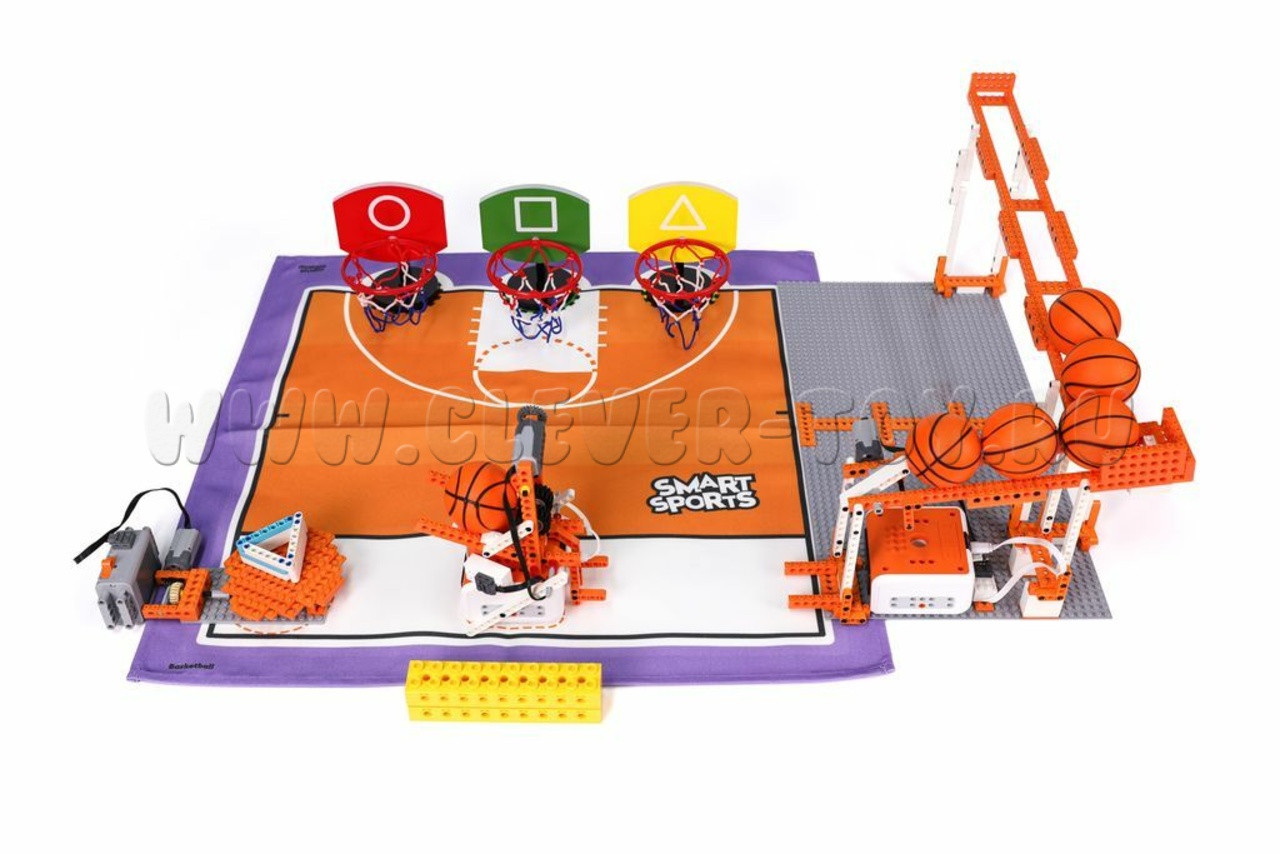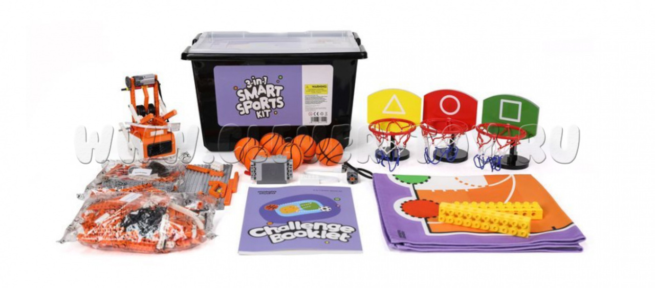 В комплекте игровые поля и комплектующие для роботов с тематикой для 3 видов спорта: футбол, легкая атлетика и баскетбол.